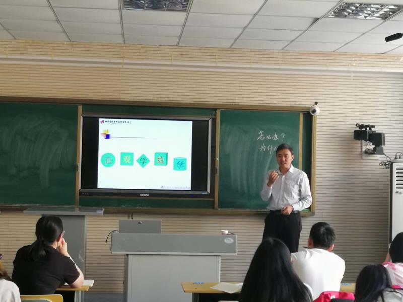 报告中,刘万元老师结合自己的从教经历与思考,阐述了自己建立在数学学科特征与小学生身心发展特点基础上的直观学数学的数学观,并结合生动的案例重点讲解了怎样教数学以及小学数学教学目标的确定。随后,刘老师又针对报告前收集的同学们的问题进行了解答,并和同学们进行了深入交流。最后,刘万元老师展示了几个小学数学中典型的例题,并对其教授方法作了讲解,让同学们更直观的理解了小学数学的讲解思路。