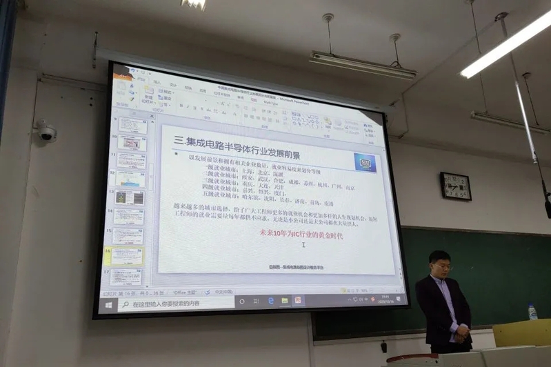 会议伊始,王鲁回顾了自己的求学岁月,表达了对母校的感激之情。接着,他围绕集成电路这个主题,为大家详细介绍了什么是集成电路、集成电路的特点以及集成电路的发展及应用前景,并结合学院专业特点有针对性地为同学们进行就业方面的指导。针对同学们关心的考研问题,王鲁也进行了细致的分析,并给出了自己的意见和建议。随后,王鲁又详细介绍了山东壹版图电子科技有限公司的基本情况,让同学们了解企业目前的招聘要求,并诚邀同学们到企业共创伟业,实现人生梦想。在互动环节,王鲁结合自身的亲身经历和感悟,就同学们在专业学习、就业方向等方面提出的具体问题,给他们做了相应的解答。